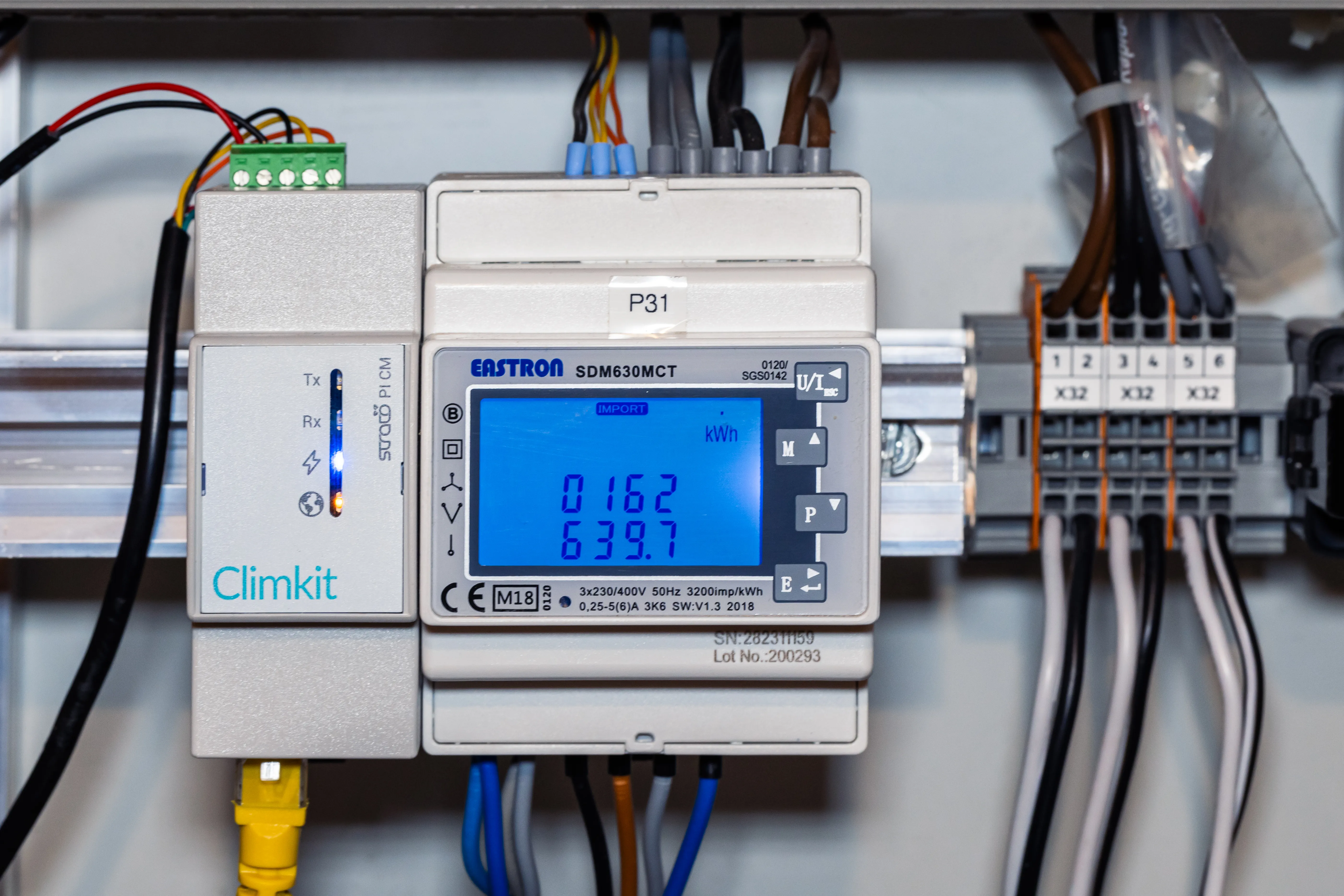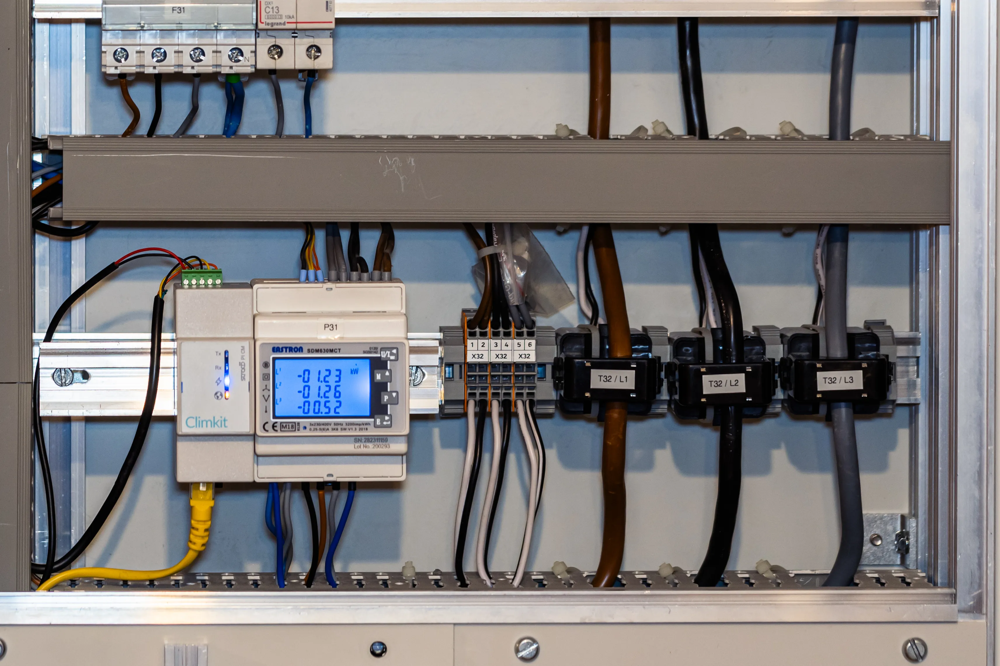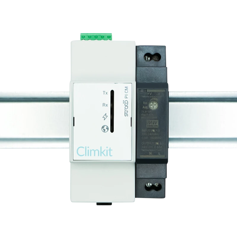 Il est livré avec une alimentation rail DIN 24V DC et se raccorde à la Gateway Climkit via RS485-Modbus (comme les compteurs électriques).