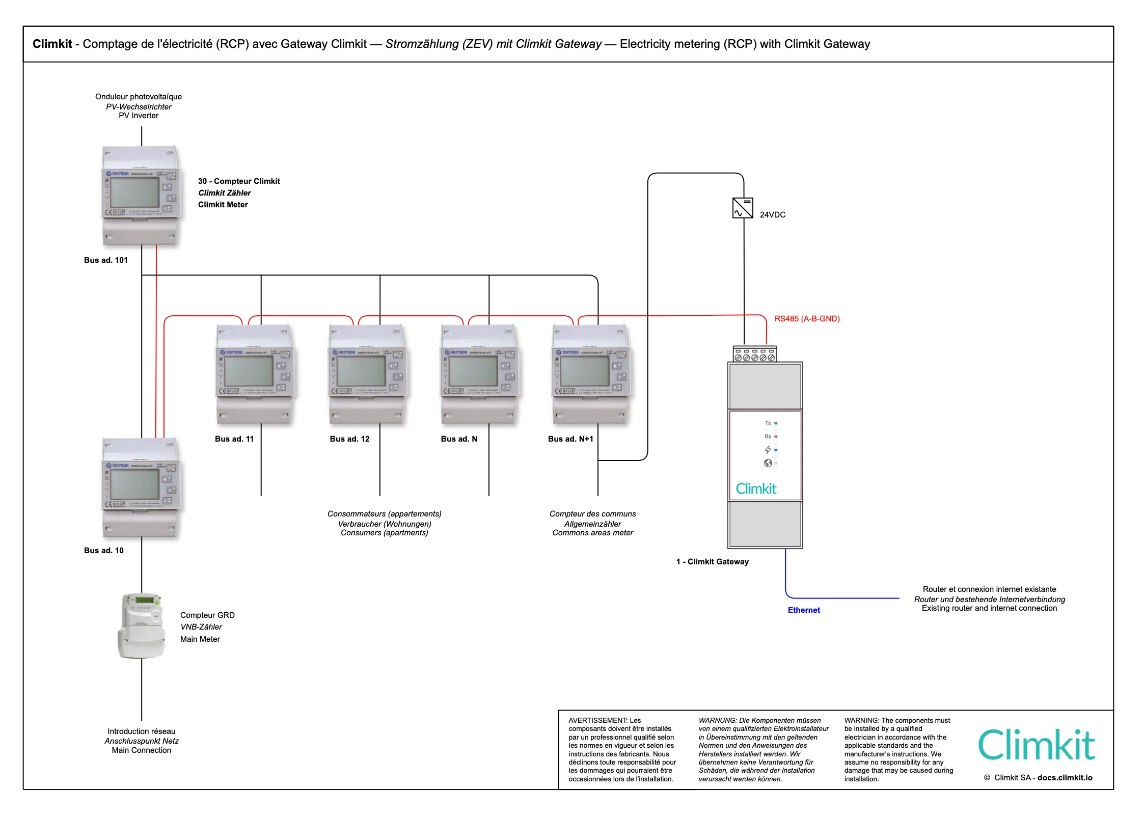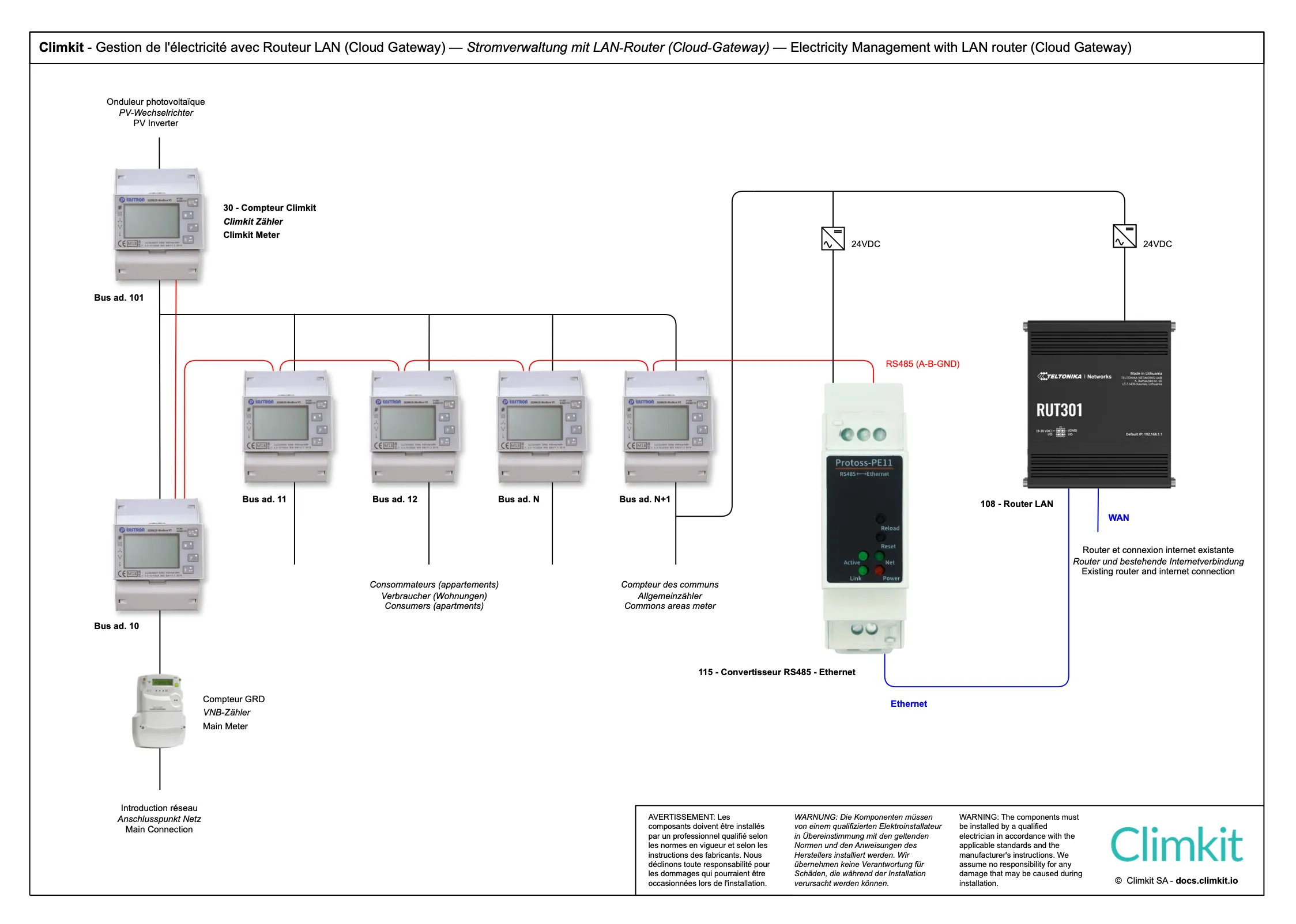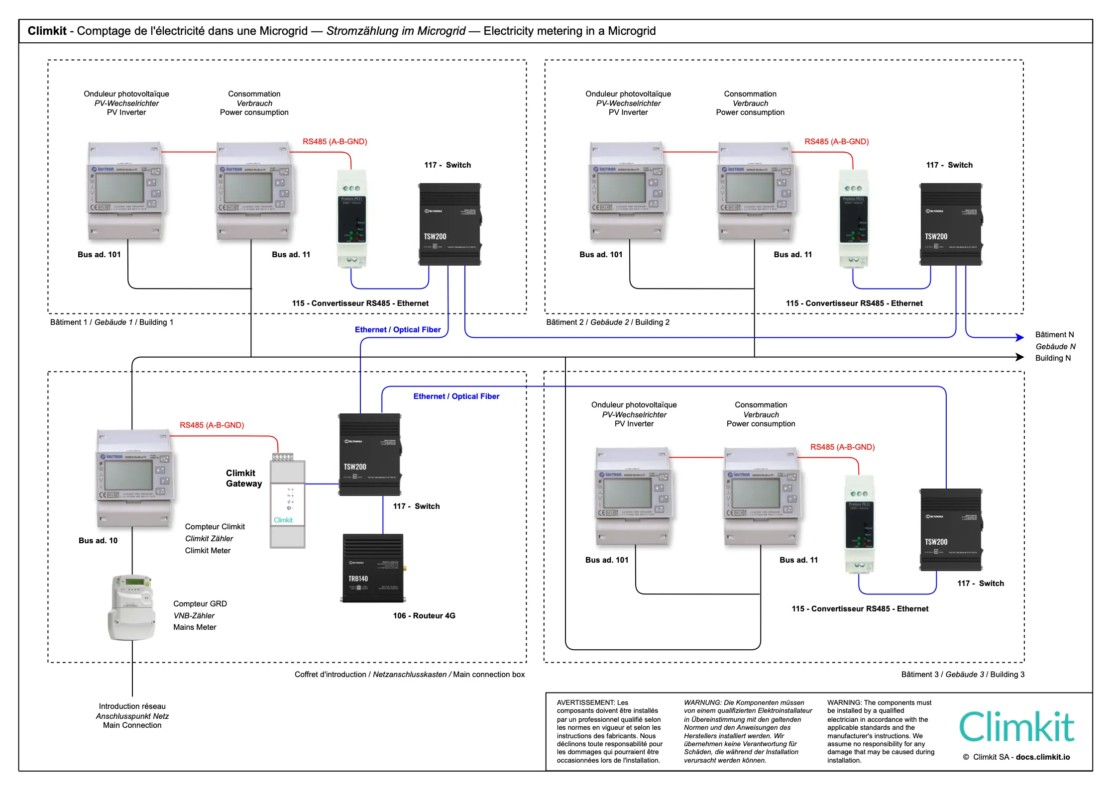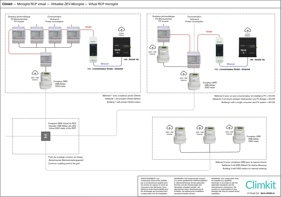 - Installation d’un bus entre les bâtiments, passant par chaque compteur jusqu’à la Gateway Climkit centrale.