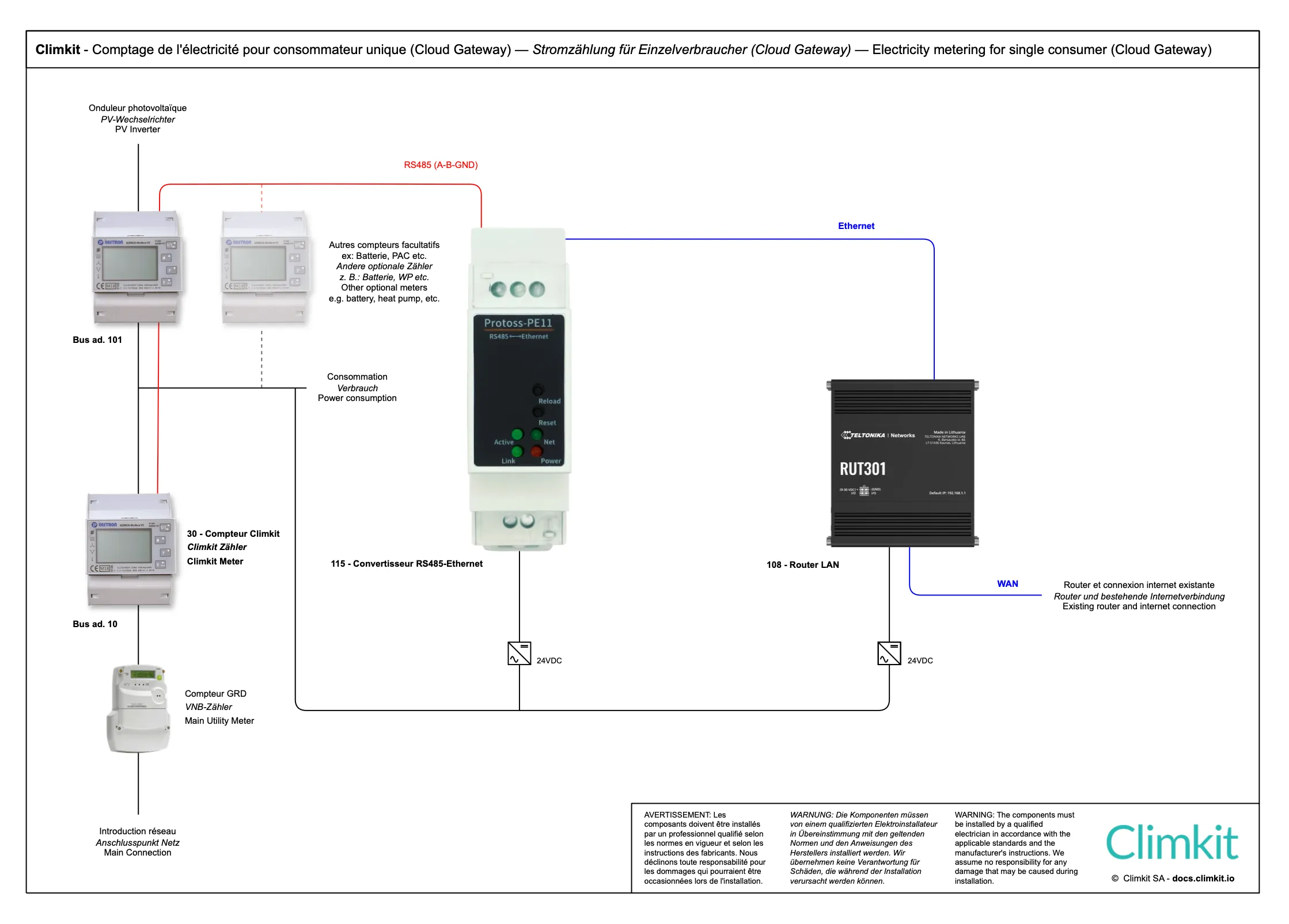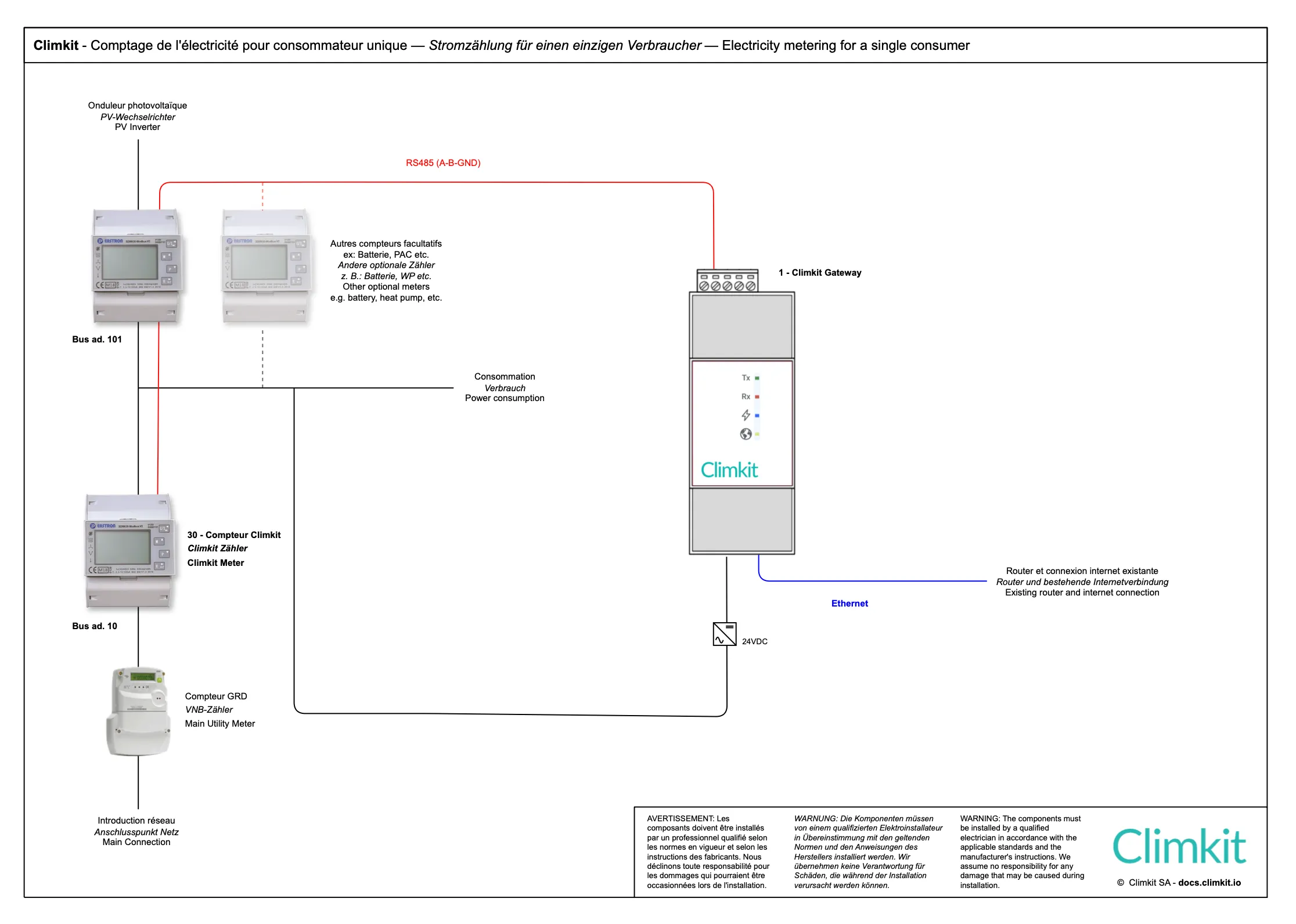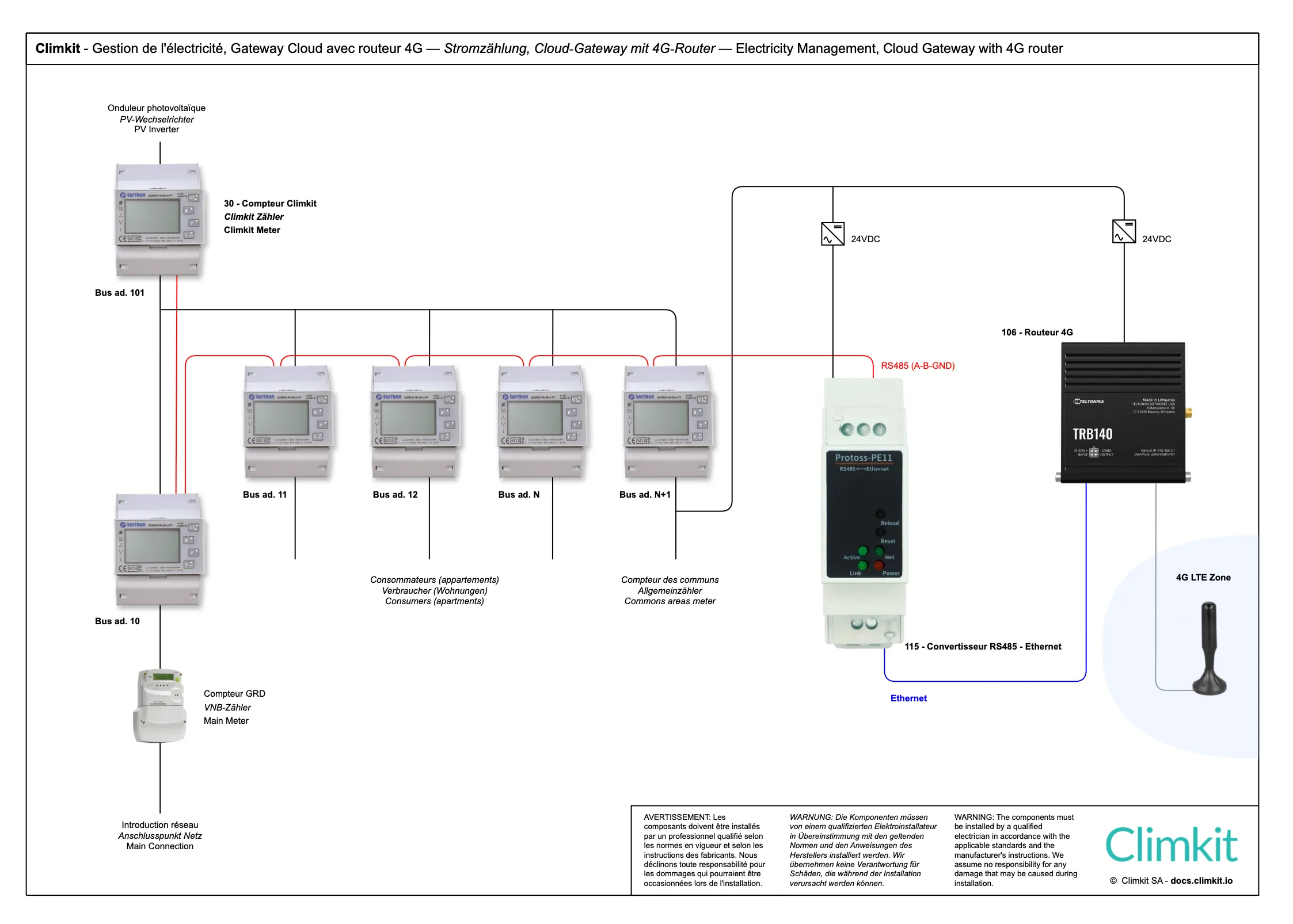 - Installation d’un bus entre les bâtiments, passant par chaque compteur jusqu’à la Gateway Climkit centrale.