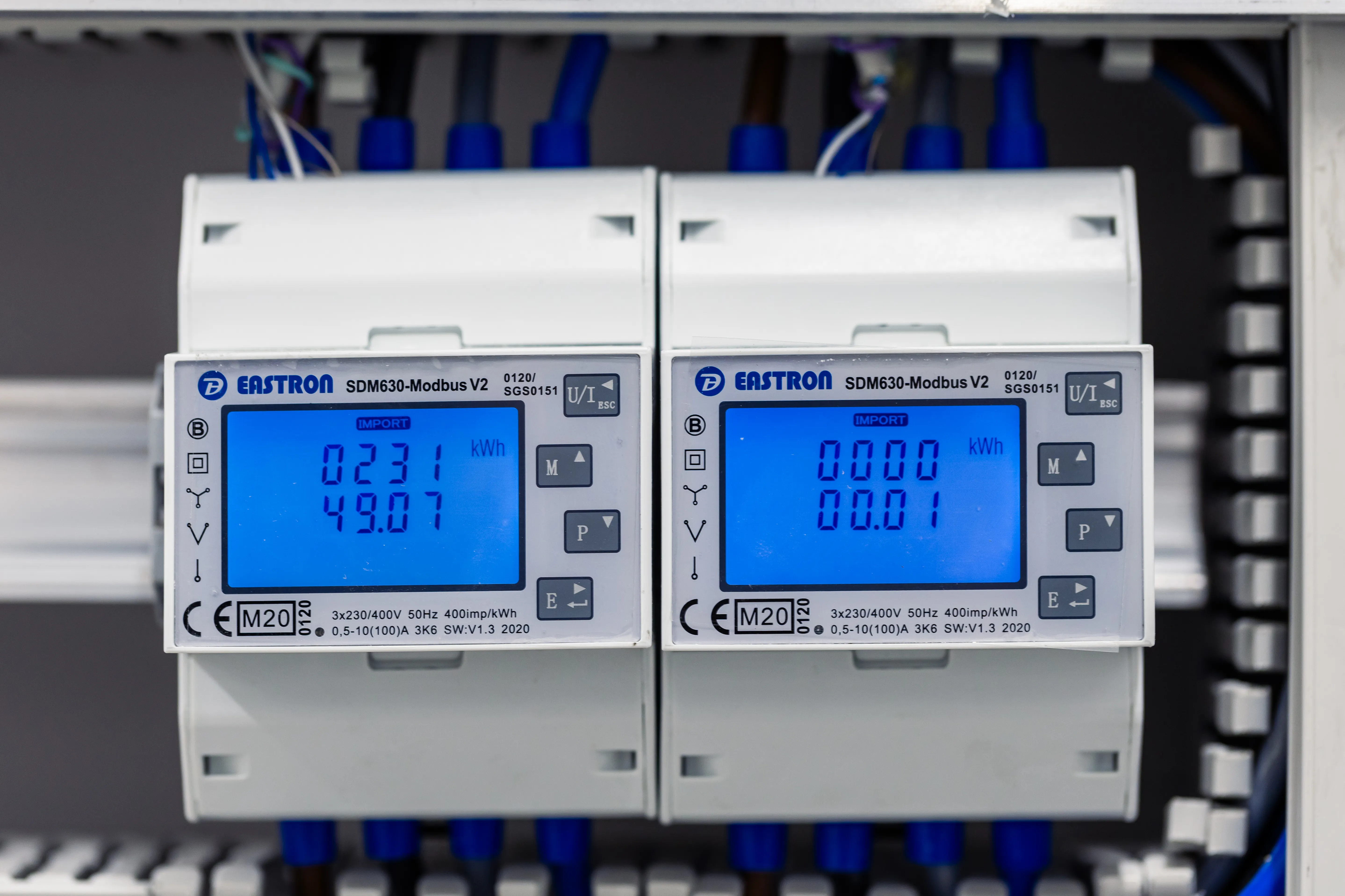 Le modèle fourni généralement est le compteur Eastron SDM630Modbus. Le compteur mesure 4 modules DIN de large et s'installe directement dans le tableau électrique sur un rail DIN ou dans un boîtier adapté (voir T-Box ci-dessous).