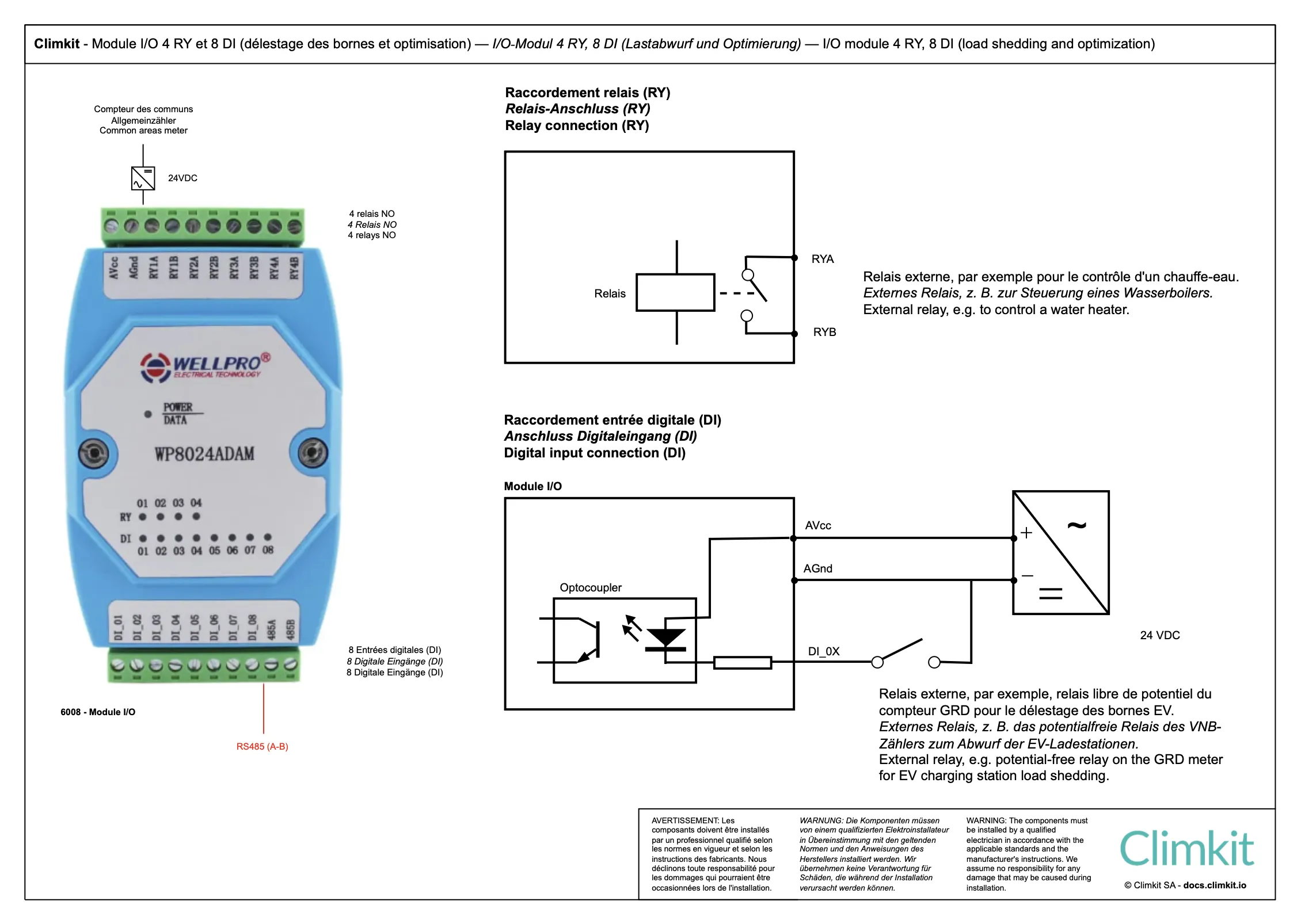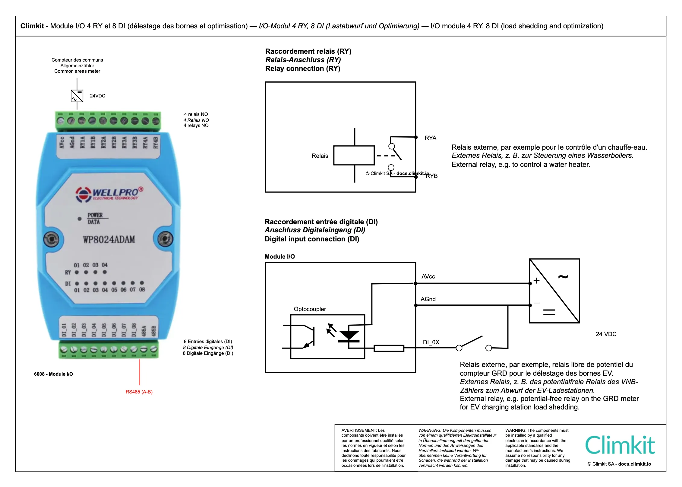 Le module I/O WP8024 est livré avec une alimentation rail DIN 24V DC et se connecte à la Gateway Climkit via RS485-Modbus.