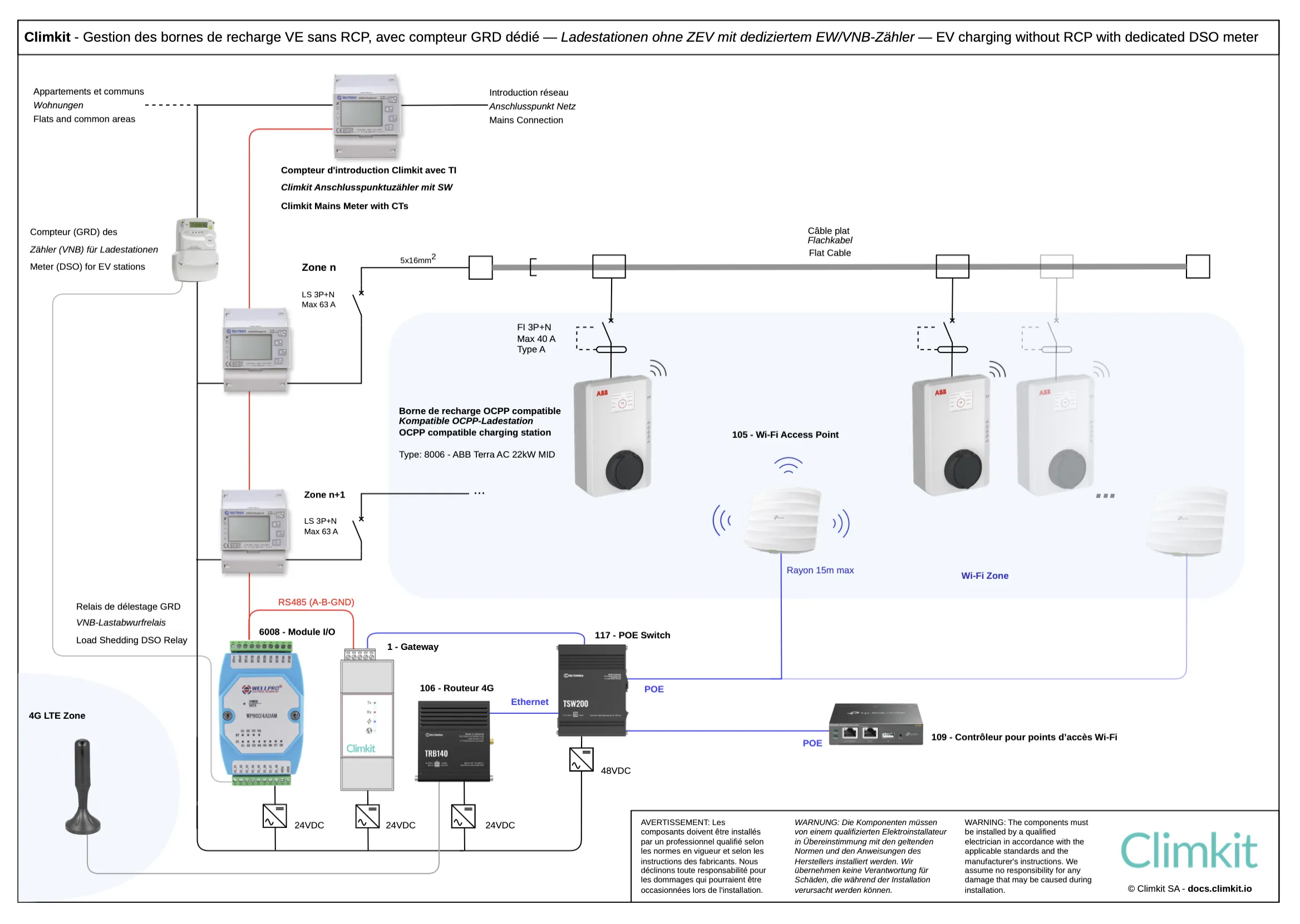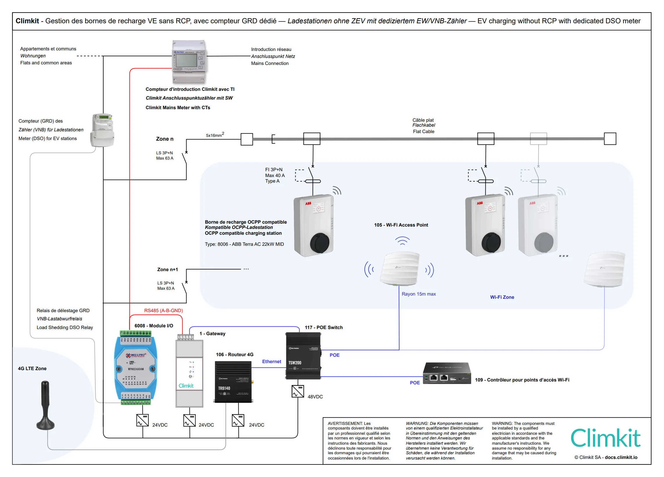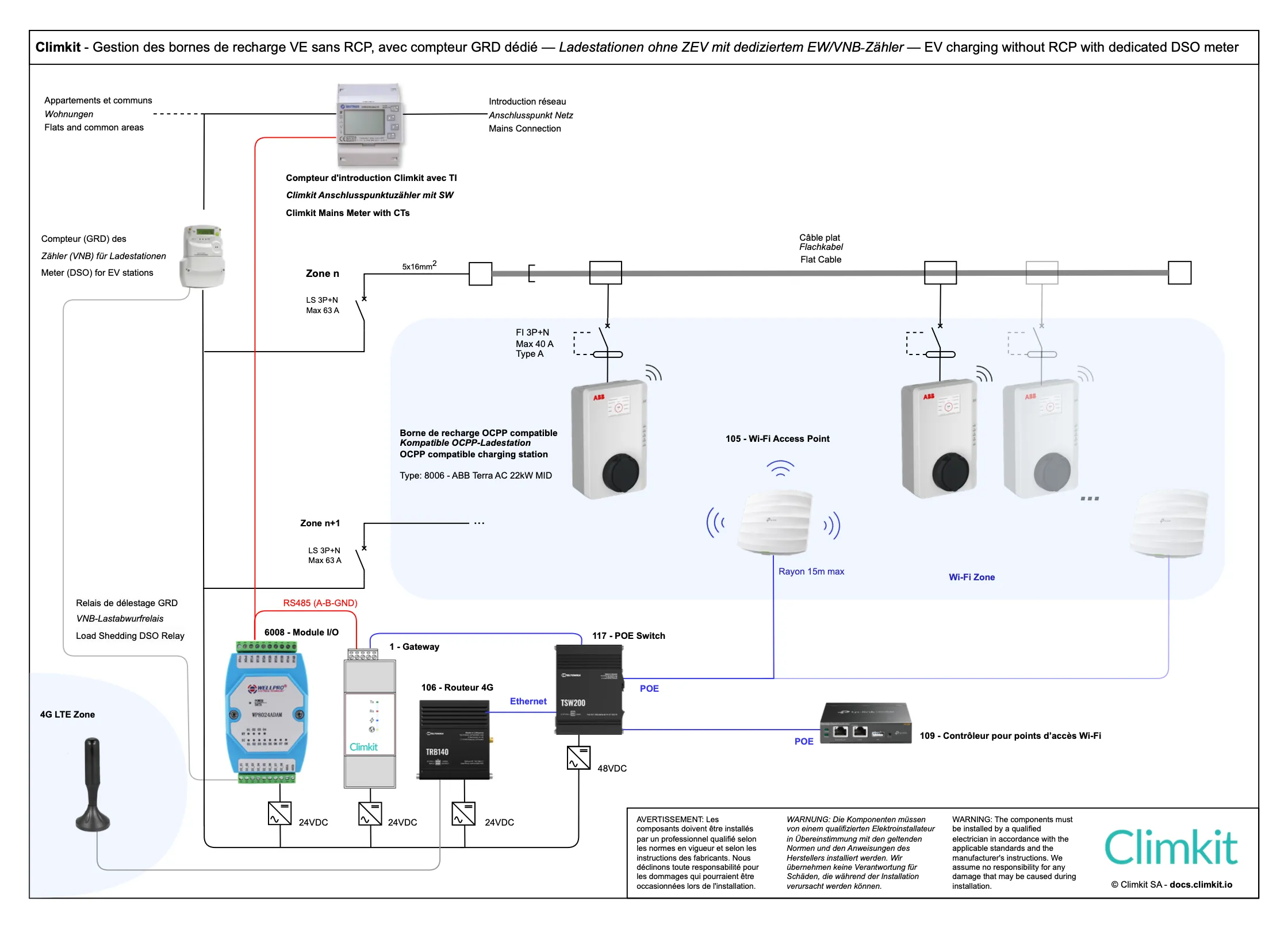Lorsqu'un système de bornes tiers est installé et gère à la fois les bornes et la gestion dynamique de la charge, il n'est pas nécessaire d'installer les équipements Climkit, car toute la communication réseau et la régulation de puissance sont assurées par ce système.