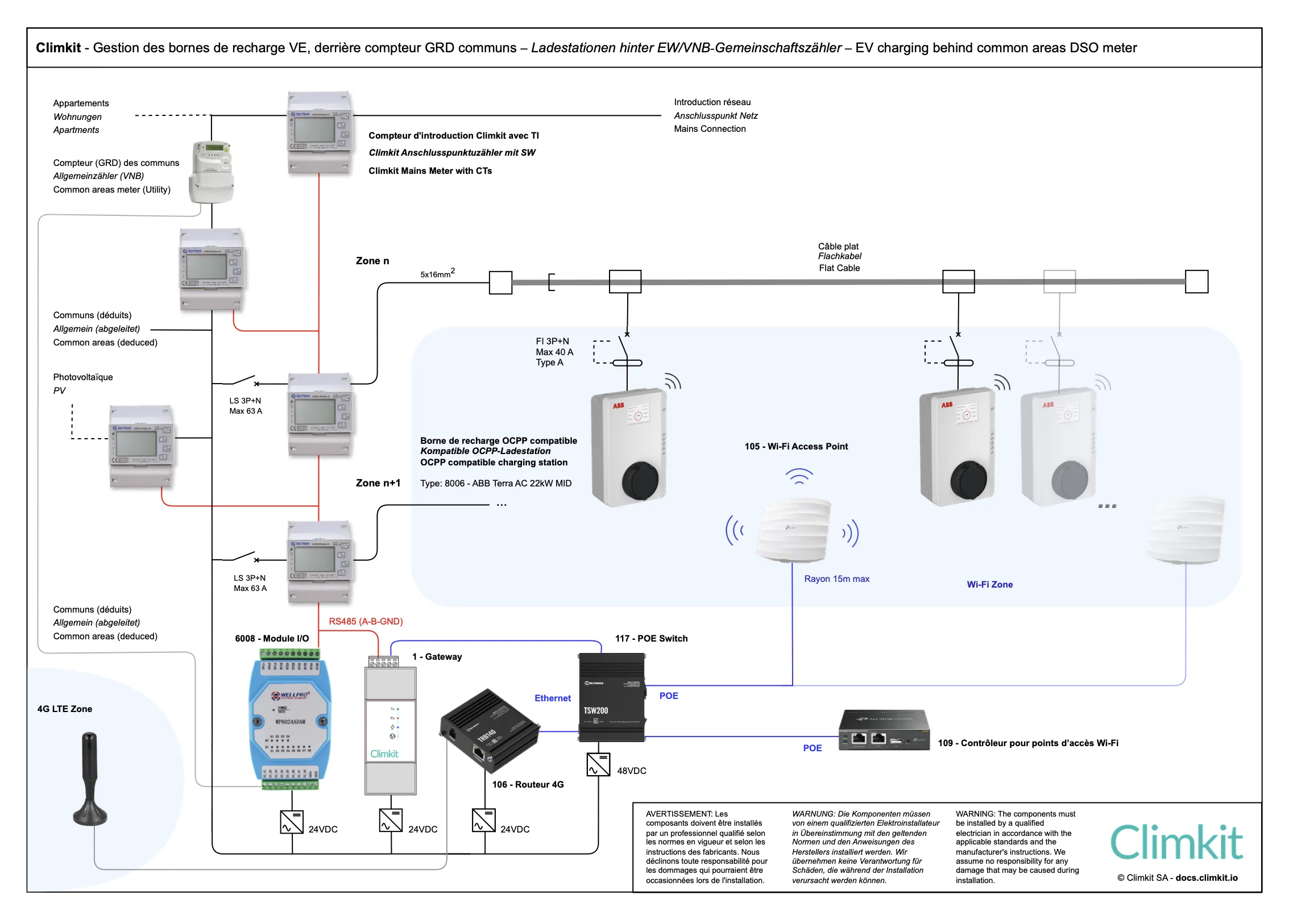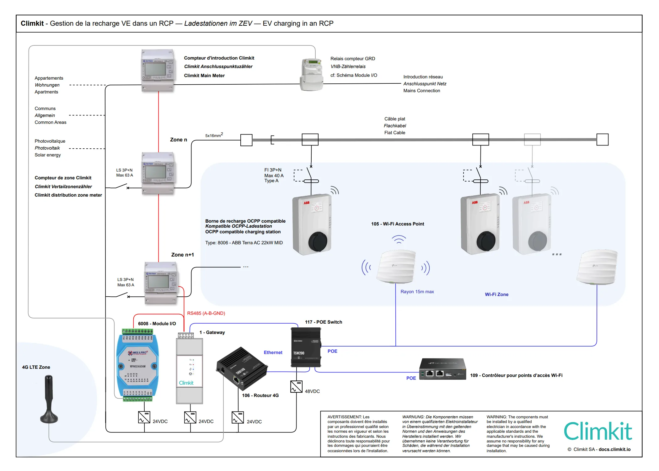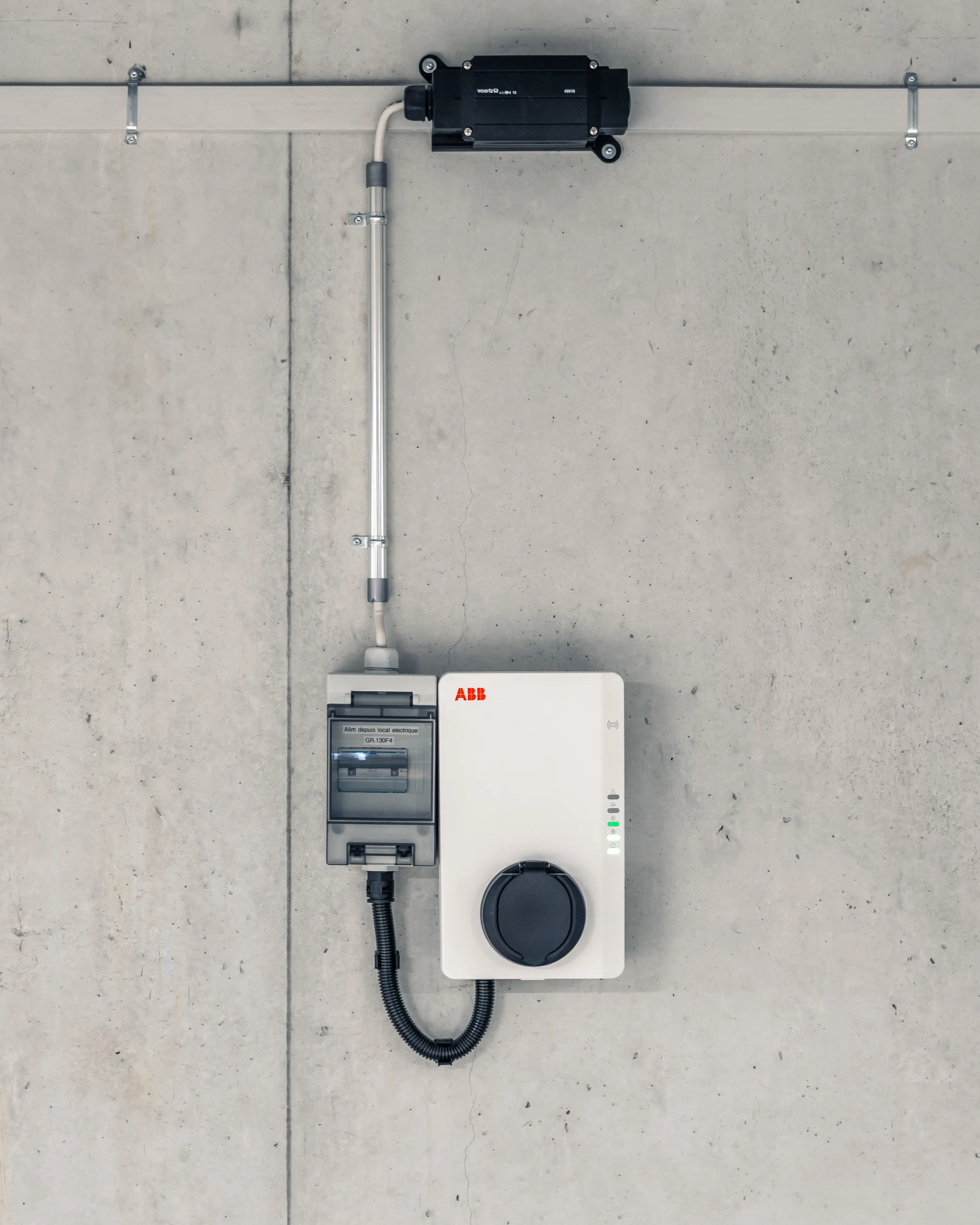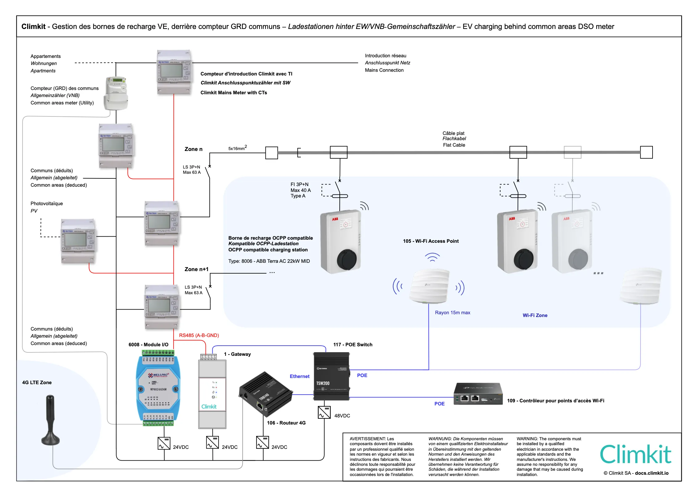 Le système consiste en l'installation de bornes de recharge dans le parking collectif de l'immeuble. Les bornes communiquent avec la Gateway Climkit via un réseau LAN (câblé ou Wi-Fi) et utilisent le protocole de communication standard OCPP.