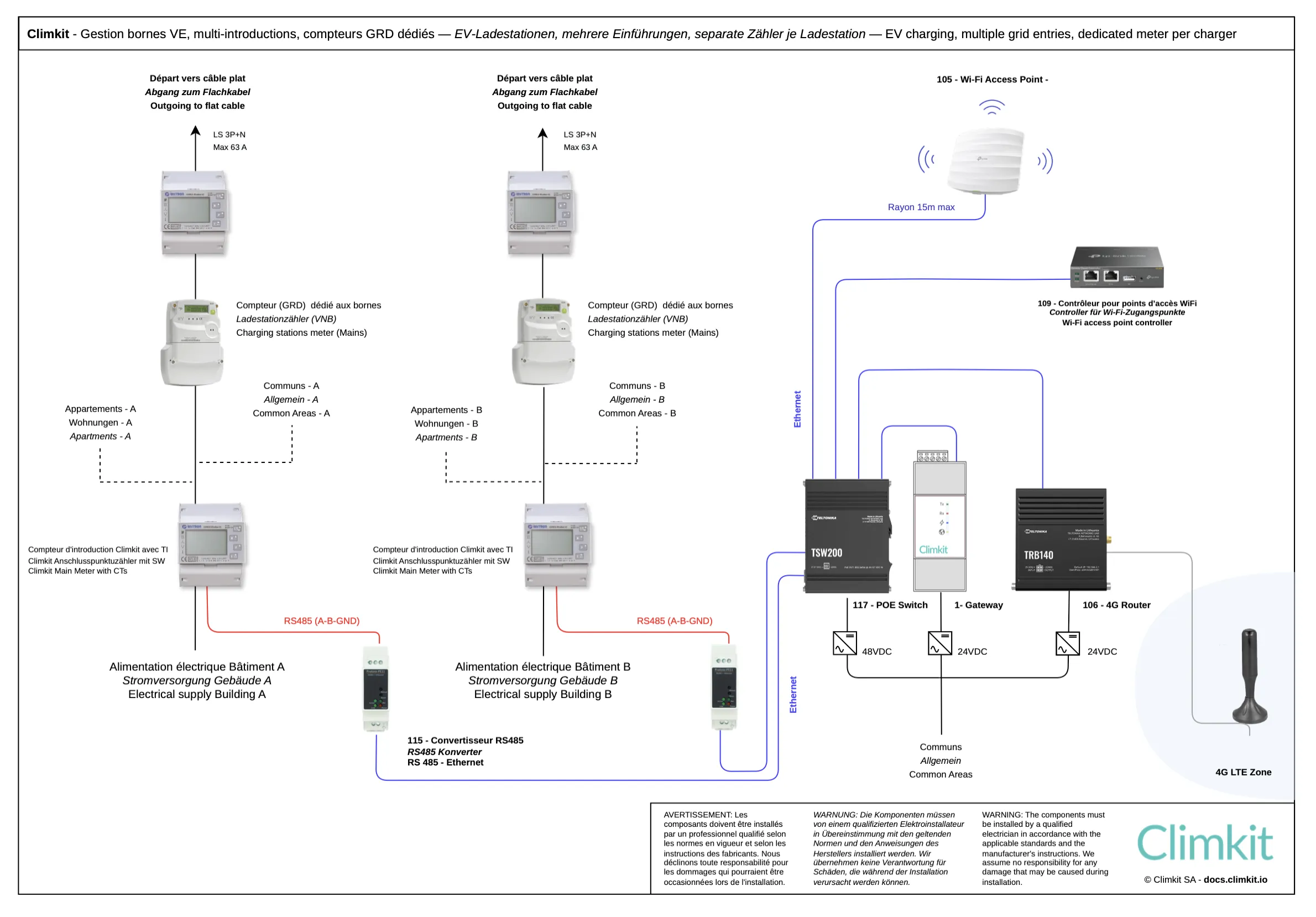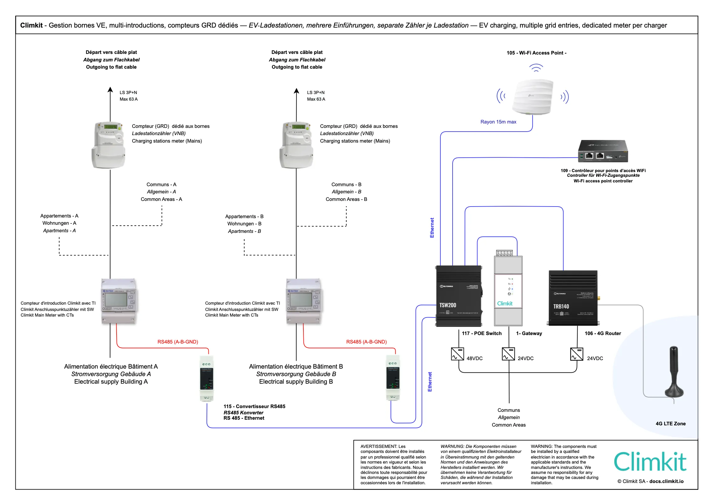 Lorsque les départs des câbles plats sont raccordés derrière un compteur GRD dédié aux bornes pour chaque immeuble, il n'est pas nécessaire d'installer de compteurs privés Climkit.