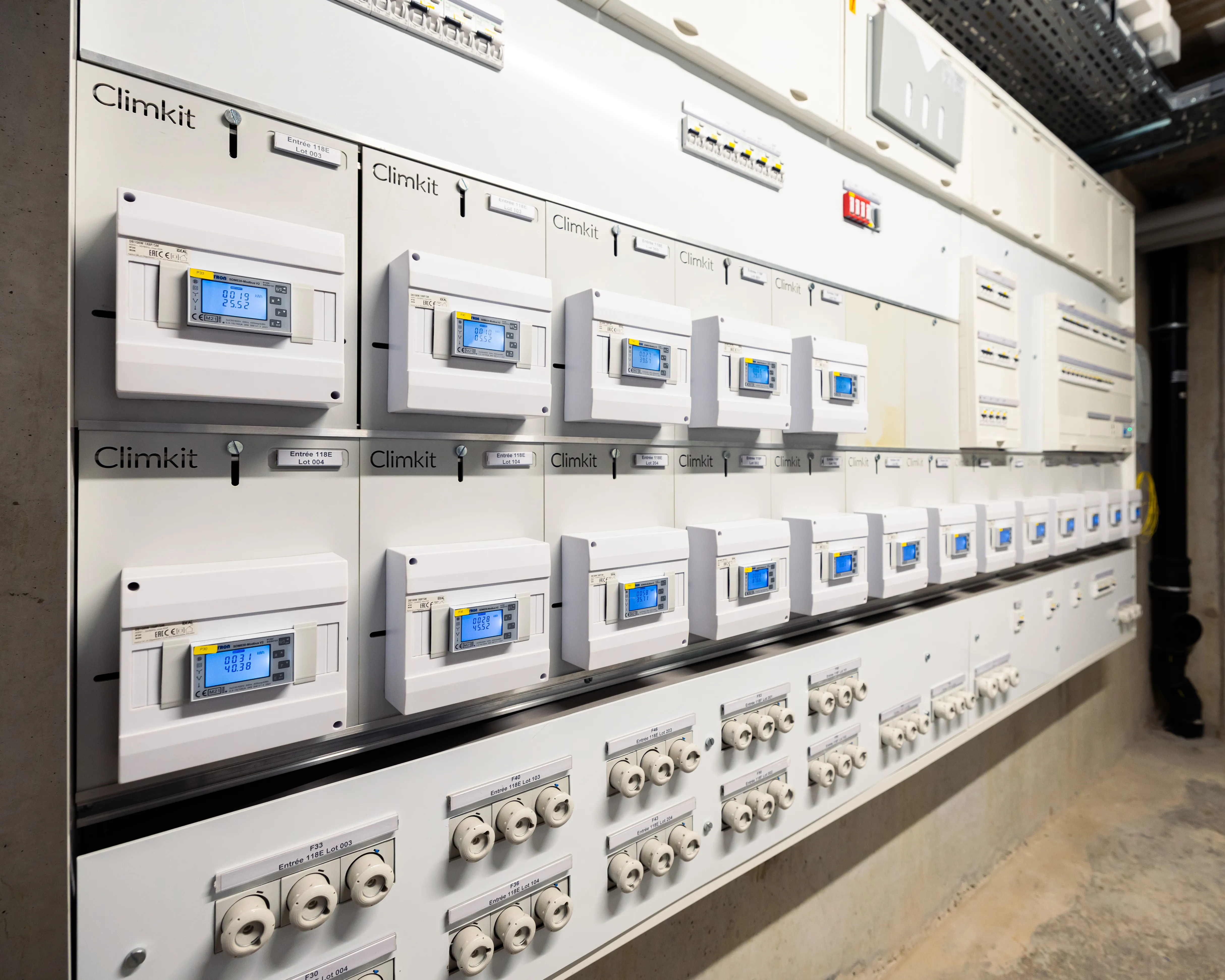Site en RCP avec un tableau de distribution et ses compteurs privés pour les appartements et les communs et un tableau d'introduction avec compteurs privés Climkit et compteurs GRD d'introduction et production photovoltaïque :