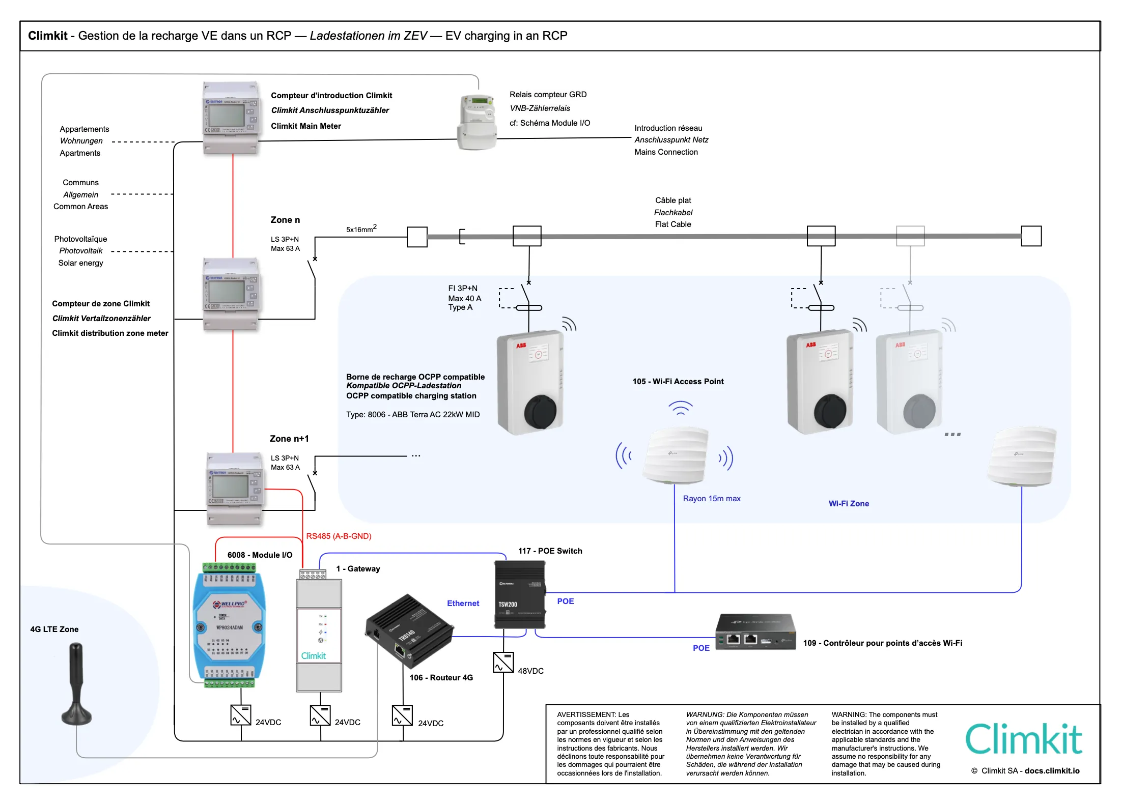 Climkit recommande une infrastructure de base constituée d'un câble plat et d'un réseau Wi-Fi pour faciliter l'ajout progressif de bornes sans intervention lourde sur le câblage existant.