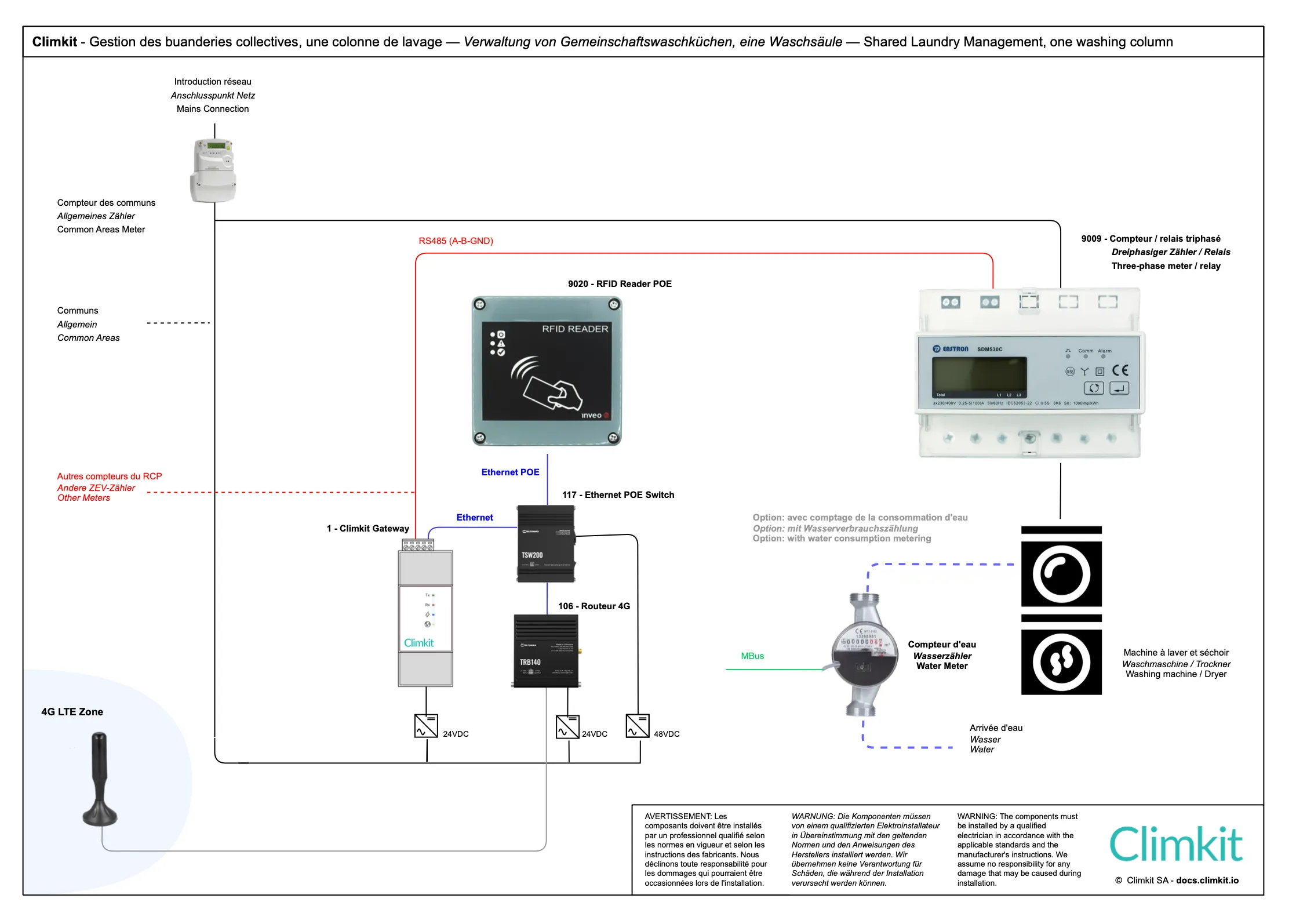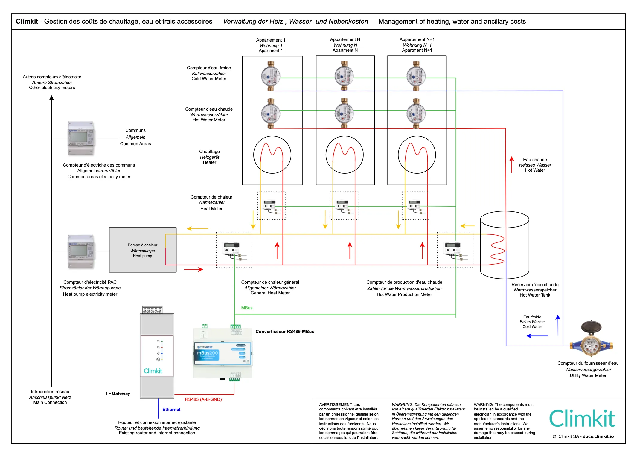 Les compteurs sont connectés en série à la Gateway Climkit par un bus de communication RS485.