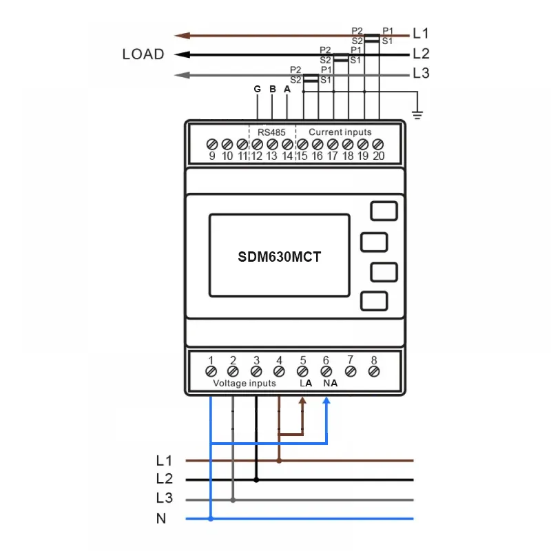 - Brancher chaque phase et le neutre sur les bornes de tension en bas du compteur selon le schéma ci-dessous.