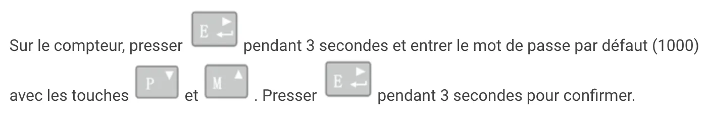 Presser la touche "E" pendant 3 secondes et entrer le mot de passe par défaut (1000) avec les touches "P" et "M". Valider en pressant "E" longtemps.